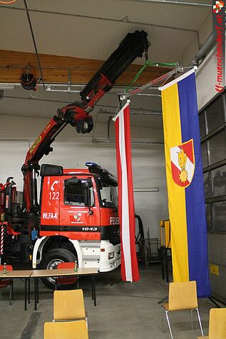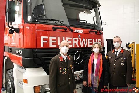 Im Anschluss an die Berichterstattung wurde das kürzlich erworbene und generalüberholte neue Wechselladerfahrzeug mit Bergekran der anwesenden Mannschaft präsentiert. Wegen der Corona-Pandemie und des damit verbundenen Veranstaltungsverbots entschied sich das Kommando dazu, das Fahrzeug im Zuge der Jahreshauptversammlung in den Dienst zu stellen und verzichtete demnach auf einen großen Festakt. Als Ehrengäste durften wir jedoch Bürgermeister Josef Ehrenberger, Vizebürgermeisterin Helga Reisenauer sowie die designierte Fahrzeug-Namenspatin und Frau des amtierenden Kommandant-Stellvertreters, Stella Bokor, für den offiziellen Teil der Indienststellung des so genannten WLFA-K (Wechselladerfahrzeug Allrad mit Kran) begrüßen.
