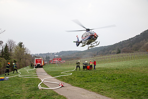 Zur Unterstützung der örtlich zuständigen Feuerwehr wurden die Feuerwehren Brunn am Gebirge, Gumpoldskirchen, Hinterbrühl, Wiener Neudorf und Guntramsdorf alarmiert. Die ersten Einheiten der FF Mödling stiegen zu Fuß von der Brühler Straße aus zum Einsatzort auf, konnten dabei aber nur leichtes Gerät mitführen. Einsatzleiter Peter Lichtenöcker: „Aufgrund der Lage haben wir in den ersten zehn Minuten entschieden, dass eine Brandbekämpfung aus der Luft notwendig ist“. Zu diesem Zweck wurden Hubschrauber des Innenministeriums angefordert, um mit einem Löschbehälter Wasser über der Brandstelle abzuwerfen. Zusätzlich konnten mit der leistungsstarken FLIR-Wärmebildkamera der Flugpolizei Glutnester aus der Luft erkannt werden. Um den Hubschrauber mit Wasser versorgen zu können, wurde in den Weingärten oberhalb der Riegerstraße ein Landeplatz eingerichtet – die notwendigen Schlauchleitungen wurden über Privatgrundstücke von der Riegerstraße aus verlegt.