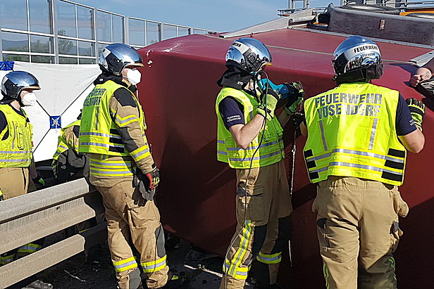 Mit Muskelkraft wurde der Anhänger wieder aufgerichtet und anschließend aus der Gefahrenzone verbracht. Nach rund 2 ½ Stunden konnte die Mannschaft wieder einrücken