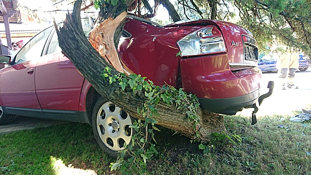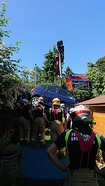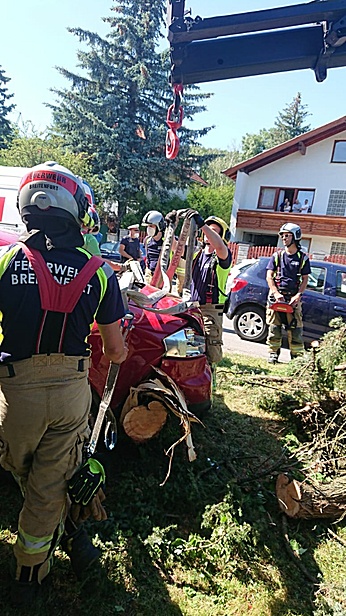 Der in den Garten gestürzte PKW wurde unter Einsatz eines Bergekrans des Schweren Rüstfahrzeuges geborgen und mittels Abschleppachse abtransportiert. Der zweite am Grundstück geparkte PKW wurde ebenfalls mit Hilfe des Krans von einem abgerissenen Baumstamm gehoben und abtransportiert.