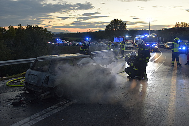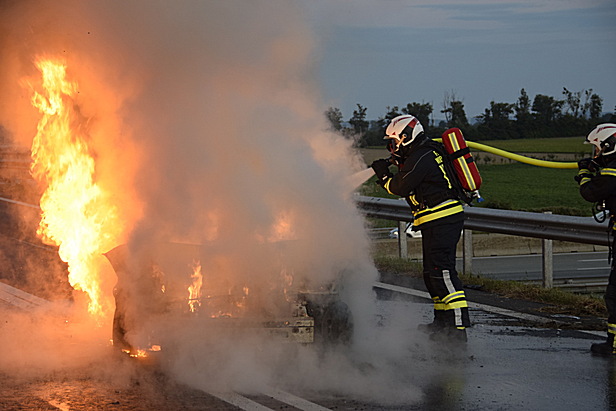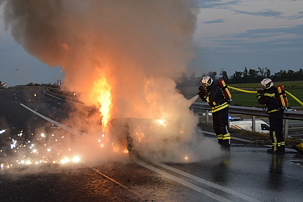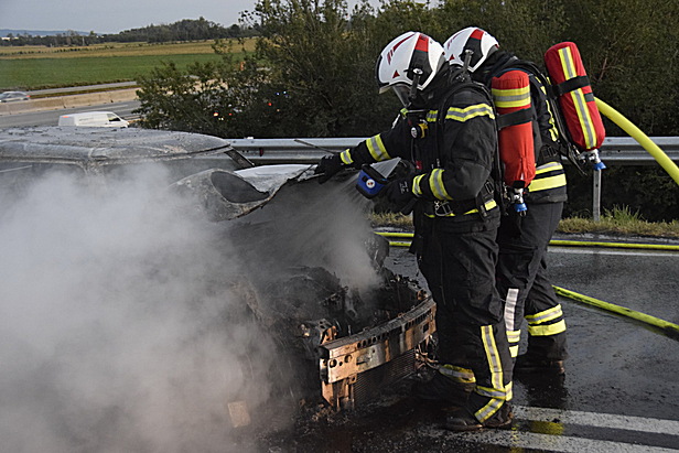 Aus bisher unbekannter Ursache geriet kurz nach 19:00 Uhr ein PKW am 12. September 2021 auf der Rampe zur Südostautobahn (A3) am Knoten Guntramsdorf in Brand.