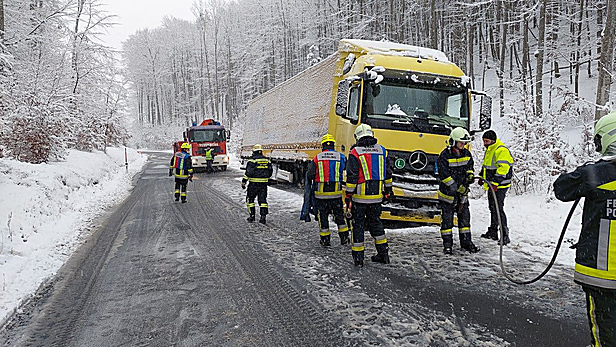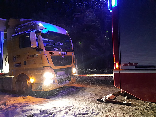 Bereits gegen 5:50 Uhr wurde die FF Gaaden zu einer Lkw-Bergung auf die L4010 alarmiert. Der Lkw ohne Schneeketten blieb auf der rutschigen Fahrbahn hängen. Kurzerhand konnte die Feuerwehr den Lkw mittels Abschleppstange des Rüstlöschfahrzeuges auf ein flaches Straßenstück ziehen, wo er wenden und seine Fahrt über die geräumten Straßen Richtung Mödling fortsetzen konnte. Fünf Feuerwehrmitglieder waren mit zwei Fahrzeugen ca. eine Stunde im Einsatz.
