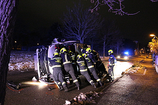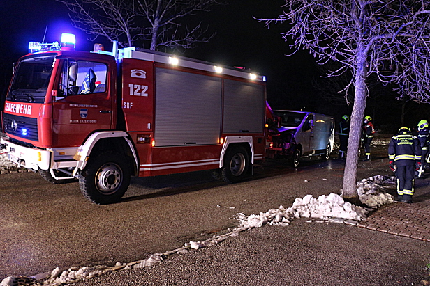 Beide Insassen blieben glücklicherweise unverletzt, wählten aber den Feuerwehrnotruf 122, da sie das Fahrzeug nicht selbstständig verlassen konnten. Aus diesem Grund alarmierte die Bezirksalarmzentrale Mödling um 21:54 Uhr die Freiwillige Feuerwehr Maria Enzersdorf zum Technischen Einsatz. Bereits wenige Minuten später konnte das Vorausfahrzeug der Feuerwehr Maria Enzersdorf zum Einsatzort ausrücken und mit den Erstmaßnahmen beginnen.