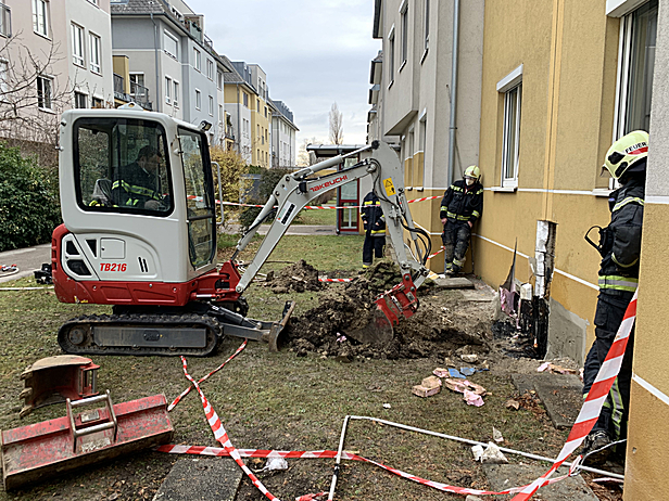 Um eine Brandausbreitung auf die Fassade, sowie Dämmmaterial, und eine weitere Rauchentwicklung in den Gebäuden zu unterbinden war es notwendig den Brand in der Dehnfuge restlos abzulöschen. Dafür wurde die an der Decke der Tiefgarage verlaufende Dehnfuge mit einem Bagger geöffnet. Der Bagger wurde durch die Feuerwehr Mödling mittels Abschleppfahrzeug zur Einsatzstelle gebracht und durch einen sachkundigen Feuerwehrmann bedient.