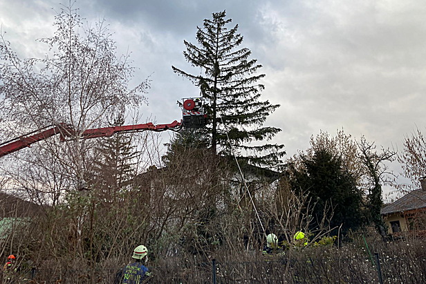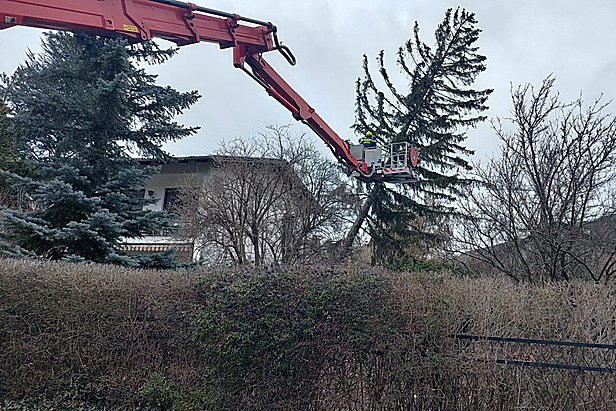 Gegen 14:30 Uhr rückte die Feuerwehr zu einem zeitintensiven Einsatz an die Königswiese in den Ortsteil Vorderbrühl aus. Dort musste ein etwa 15 Meter hoher Nadelbaum, der auf eine Gartenhütte und ein Haus zu stürzen drohte, mithilfe des Hubrettungsgeräts abgetragen werden. Nach über zweieinhalb Stunden Arbeit konnte dieser aufwendige Einsatz beendet werden.