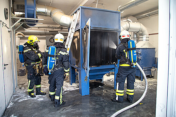 Vorort kam es zum Brand einer Filteranlage, welche bereits auf Teile der Umgebung überzugreifen drohte. Mitarbeiter führten bereits erste Löschmaßnahmen mit Handfeuerlöschern durch, mussten diese jedoch aufgrund der Rauchentwicklung abbrechen. Rasch konnte ein Atemschutztrupp mit einer Löschleitung die Brandbekämpfung einleiten. Parallel dazu wurde das Gebäude auf Personen durchsucht. Glücklicherweise befanden sich zu diesem Zeitpunkt keine Personen mehr im Gebäude.