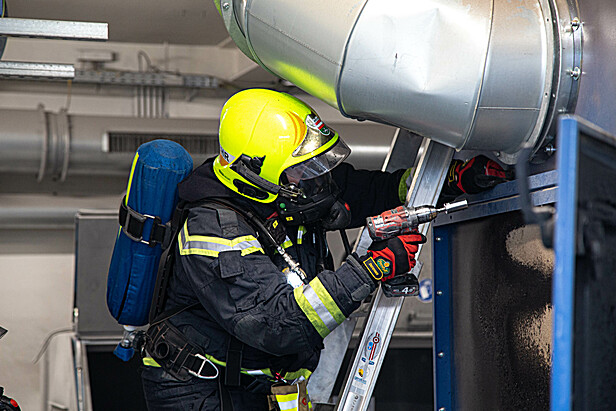 Zusätzlich ausgerückte Fahrzeuge stellten einen Reserve-Atemschutztrupp und bauten eine Überdruckbelüftung auf. Binnen Minuten konnte der Brand unter Kontrolle gebracht werden. Es folgten Nachlöscharbeiten unter Zuhilfenahme einer Wärmebildkamera. Weiters wurde die gesamte Abzugsanlage, auch im Dachbereich, kontrolliert.