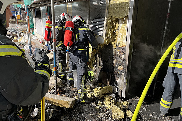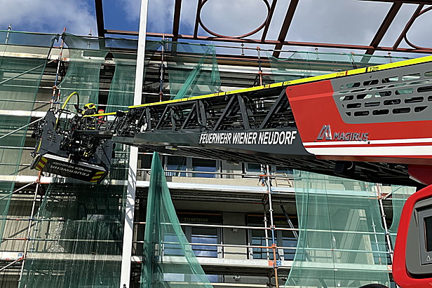Nachdem das Feuer rasch gelöscht werden konnte, wurde die Fassade händisch geöffnet und Nachlöscharbeiten auch aus dem Korb der Drehleiter durchgeführt.