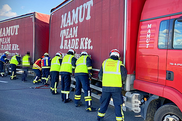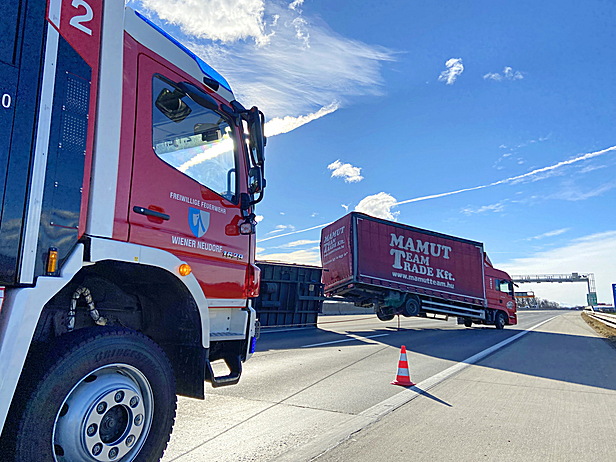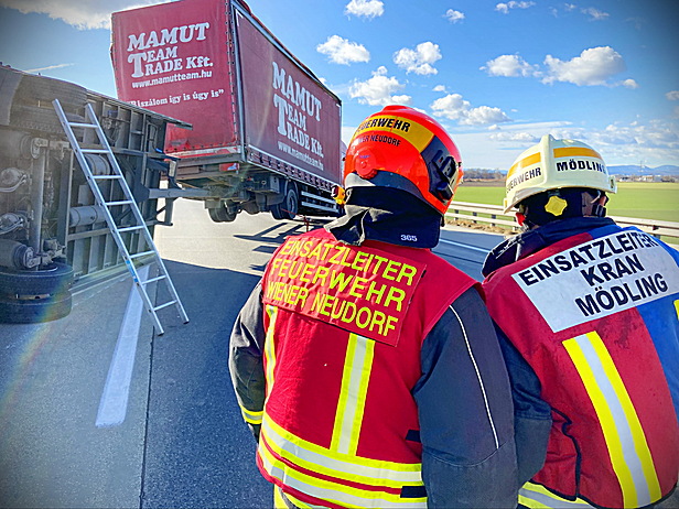 Die zur Bergung alarmierte Freiwillige Feuerwehr Wiener Neudorf rückte mit drei Fahrzeugen auf die Autobahn aus. Unverzüglich wurde nach Ankunft der Einsatzkräfte wurde das mit der Hinterachse in der Luft schwebende Zugfahrzeug mit einer Seilwinde gegen Umfallen gesichert. Gemeinsam mit dem umgestürzten Anhänger blockierte der Lkw alle vier Fahrspuren und sorgte für eine Totalsperre der Südautobahn.