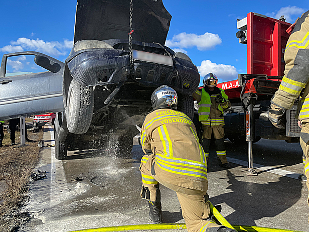 Kurz vor dem Einrücken erfolgte die nächste Alarmierung zu einem Fahrzeugbrand auf der S1. Umgehend rückten die Einsatzkräfte zur neuen Einsatzstelle aus. Auf dem Pannenstreifen kurz vor der Abfahrt Vorarlberger Allee hatte ein Geländewagen aus unbekannter Ursache Feuer gefangen, Beamte der Autobahnpolizei und Mitarbeiter der ASFiNAG hielten den Brand mit Feuerlöschern unter Kontrolle.