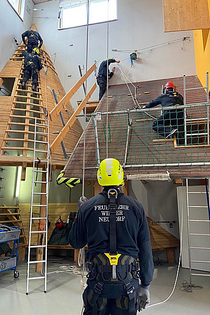 Bei den dabei gelernten Sicherungsvarianten handelt es sich um einfache Lösungen, die von jedem schwindelfreien Feuerwehrmitglied beherrscht werden sollten. Für spezielle Rettungen aus Höhen und Tiefen verfügt die FF Wiener Neudorf zusätzlich seit mehreren Jahren über eine ebenfalls in der Höhenwerkstatt ausgebildete Höhenrettungsgruppe.