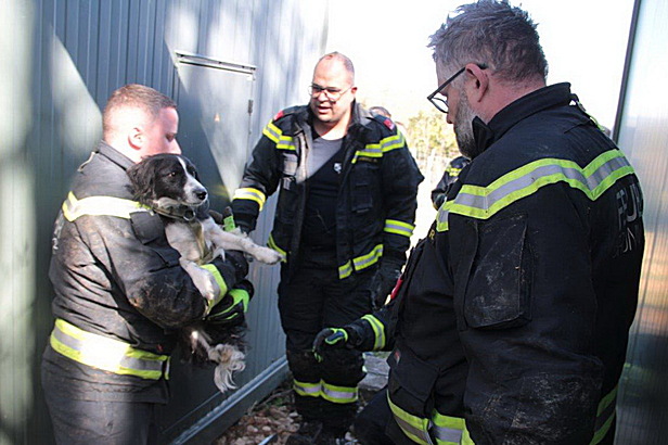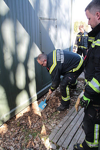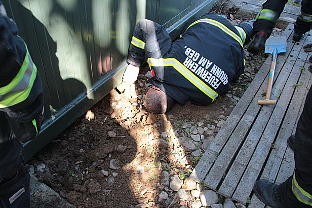 Um eine größere Öffnung für den Hund zu schaffen, wurden einige Gegenstände aus dem Weg geräumt und mit einem Spaten und Krampen der Hohlraum unter dem Container vergrößert. Nach wenigen Minuten des guten Zuredens und Beruhigens bewegte sich das verschreckt Tier etwas näher an die Helfer heran, sodass mit einigen geschickten Handgriffen aus seiner misslichen Lage befreit und unverletzt seinen Besitzern übergeben werden konnte.
