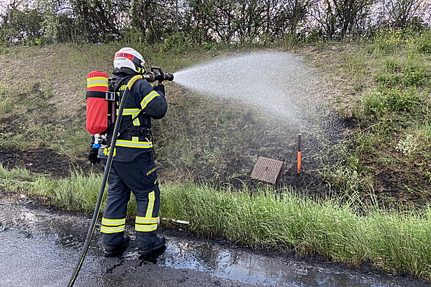 Da bei Ankunft der Feuerwehr nicht nur das Fahrzeug in Vollbrand stand, sondern der Brand auch bereits auf die Autobahnböschung übergegriffen hatte, entschied man sich zur Vornahme von gleich zwei Löschleitungen. Aufgrund der giftigen Brandgase erfolgte der Löschangriff unter Atemschutz.