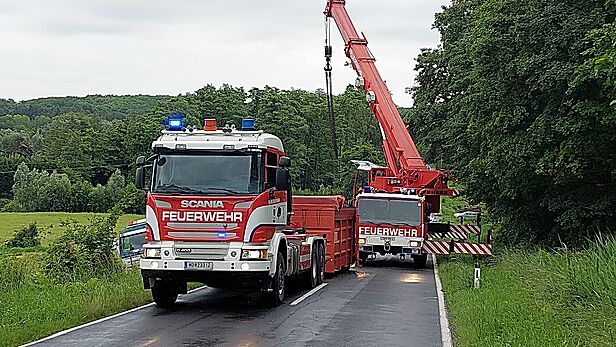 Der Einsatzleiter aus Wiener Neustadt stellte rasch fest, dass für die Bergung ein zweites Kranfahrzeug erforderlich ist. Aus diesem Grund wurde ein zweites Kranfahrzeug aus NÖ, stationiert bei der Feuerwehr Mödling, nachgefordert.