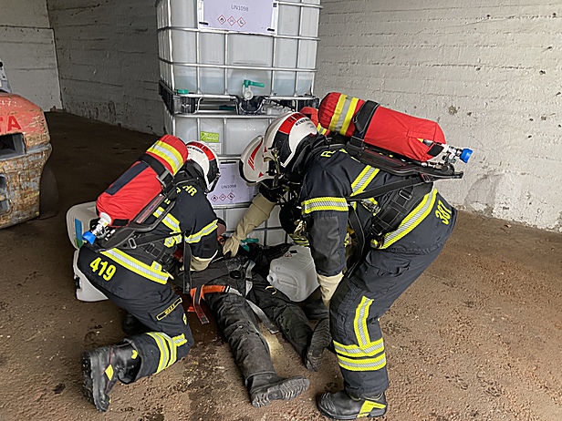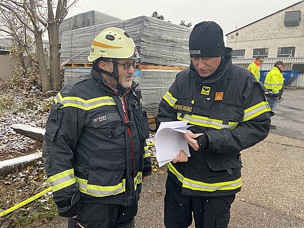 Die Feuerwehr Wiener Neudorf mit Einsatzleiter Patrick Klebinger führte daher eine Menschenrettung durch, um den Verunfallten rasch aus dem Gefahrenbereich zu bringen – ein Atemschutztrupp ausgestattet mit Chemieschutzhandschuhen zog den Arbeiter ins Freie.