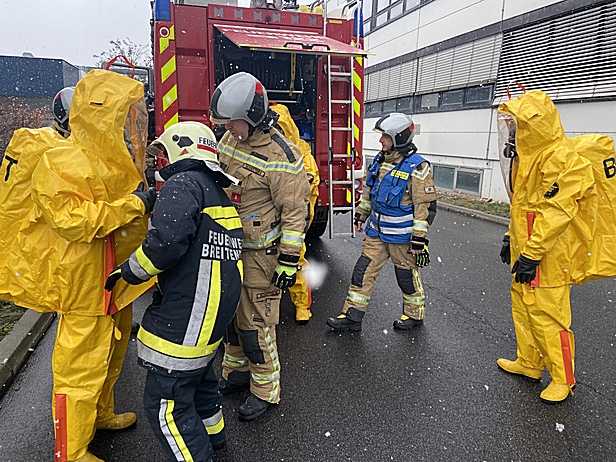 Gleichzeitig wurden der Schadstoffzug des Bezirkes Mödling sowie der Schadstoffberatungsdienst des NÖ Landesfeuerwehrverbandes alarmiert. Die Feuerwehren Perchtoldsdorf und Breitenfurt rückten mit dem in Perchtoldsdorf stationierten Dekontaminationscontainer aus, die Feuerwehr Guntramsdorf baute die Einsatzleitung auf. BSB Manfred Haslinger und Wolfgang Freiler nahmen als Team des Schadstoffberatungsdienstes an der Übung teil.