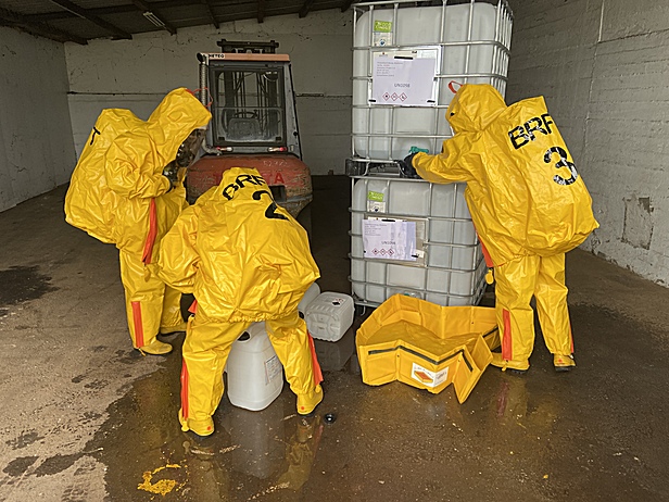 Die Feuerwehr Breitenfurt wurde beauftragt, mit Schutzanzugträgern (Schutzstufe 2) die Behälter abzudichten und die Reste der Flüssigkeit in sichere Behälter umzufüllen. Die Feuerwehr Perchtoldsdorf baute währenddessen einen Dekontaminationsplatz inkl. Zelt auf, um die Schutzanzugträger vor und nach dem Einsatz optimal zu betreuen.