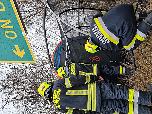 Durch starke Sturmböen, die am Freitagnachmittag über Niederösterreich gezogen sind, wurde auch in Münchendorf die Freiwillige Feuerwehr Münchendorf zu einem Einsatz mittels Sirene alarmiert. Ein Trampolin wurde aus einem Garten wortwörtlich "vom Winde verweht" und verfing sich nahe der angrenzenden Triesting in einem Baum. Bei starkem Wind entschied Einsatzleiter Reinhard Hornig, das Trampolin zu zerlegen und gesichert im Garten abzulegen. Bei der Heimfahrt vom Einsatzort musste noch ein abgebrochener Ast, der quer über die Himbergerstraße in Höhe des Friedhofs ragte, entfernt werden. Im Feuerwehrhaus eingerückt bekamen wir gleich die nächste "stille" Alarmierung. Eine besorgte Autofahrerin rief im Feuerwehrhaus an und gab bekannt, dass die Verbindungsstraße nach Laxenburg durch einen Baum verlegt war. Da die Einsatzadresse noch unklar war, fuhren die Kameraden zur Erkundung aus und merkten schnell, dass bereits die Feuerwehr Laxenburg - in deren Einsatzgebiet der Baum auf der Straße lag - die Gefahr beseitigt hatte. An diesem Tag waren zwei Fahrzeuge mit 12 Mann der Feuerwehr Münchendorf etwa eine Stunde im Einsatz.