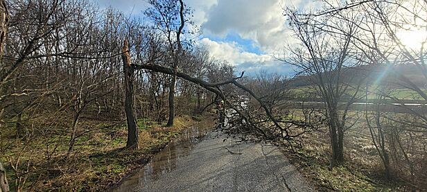 Der Tulpenweg wurde am 4. Februar von einem Baum blockiert. Dieser wurde durch den Sturm teilweise entwurzelt und abgeknickt. Mittels Motorsäge konnte der Stamm Stück für Stück entastet und am Straßenrand abgelegt. Nach knapp einer Stunde war die Straße wieder frei.