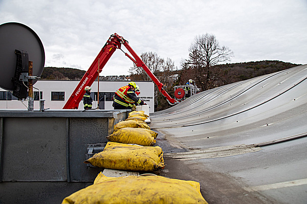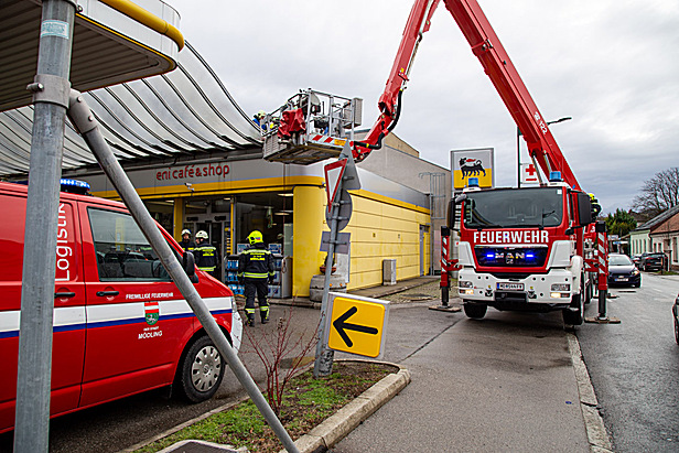 Am Vormittag des 3. Februar wurde ein ca. 60m2 großes Vordach einer Tankstelle aus der Verankerung gerissen und drohte abzustürzen. Nach kurzer Erkundung wurde entschieden das Dach mit Sandsäcken und Wasserkanistern zu sichern. Dabei wurden die benötigten Materialien mit dem Hubrettungsfahrzeug auf das Dach der Tankstelle gehoben. Für die Sicherungsarbeiten mussten Sandsäcke von der Feuerwehr Guntramsdorf angefordert werden.