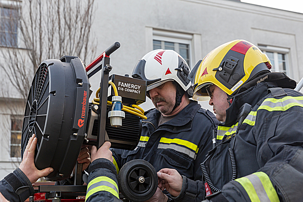 In der Zwischenzeit wurde die Drehleiter in Stellung gebracht, um bei Bedarf eine Menschenrettung durchführen zu können. An dem Korb der Drehleiter wurde ein Druckbelüfter montiert, um die Brandwohnung zu entrauchen.
