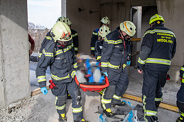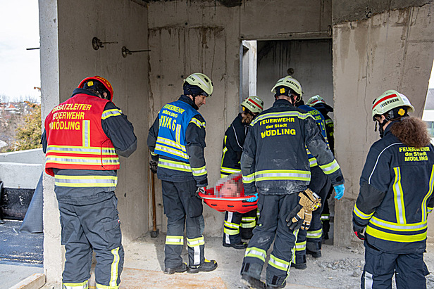 Am Einsatzort konnte eine verletzte Person in medizinischer Betreuung durch den Rettungsdienst im zweiten Obergeschoss eines in Bau befindlichen Mehrfamilienhauses festgestellt werden. Um die Person schonend vom Dach zu retten, wurde die Person in eine Schleifkorbtrage umgelagert und durch das Stiegenhaus zum Rettungswagen getragen.