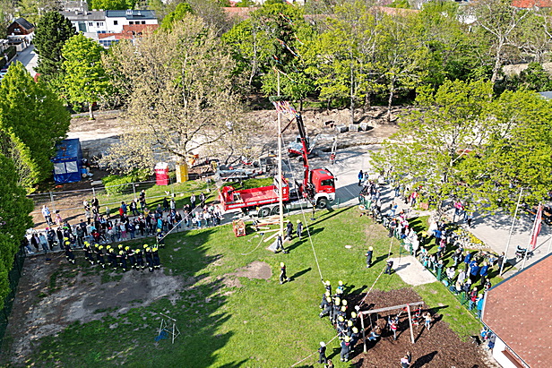 Am Nachmittag wurde dann der Maibaum vor der Jubiläumshalle durch die Feuerwehr aufgestellt. Unter den Augen zahlreicher Besucher wurde mit dem Kran des Wechselladefahrzeuges und Muskelkraft der Mitglieder der Baum aufgestellt und eingerichtet.