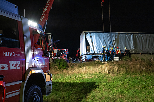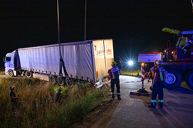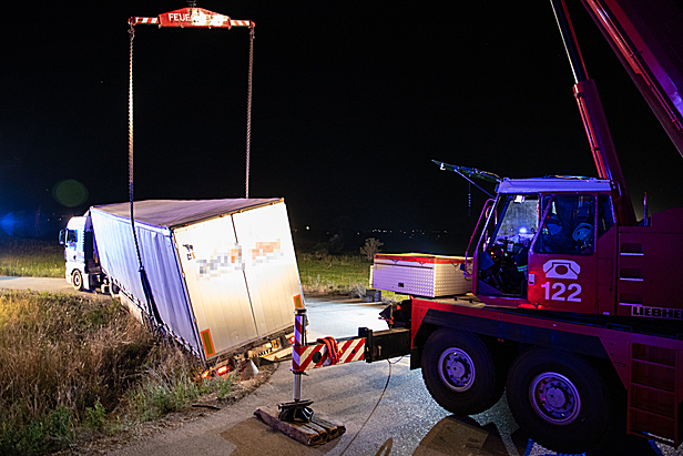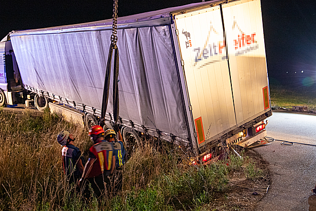 An der Einsatzstelle fanden die örtlichen Einsatzkräfte einen Sattelschlepper (ca. 32 Tonnen schwer) vor, der in gefährlicher Schieflage im Straßengraben hing. Der LKW-Fahrer wollte auf dem Platz in der Nebenfahrbahn seinen geplatzten Reifen wechseln und geriet dabei zu nahe an den Straßengraben, wo der Auflieger mit allen drei Achsen abrutschte. Dabei blockierte der Sattelschlepper einen Verkehrsweg und drohte umzustürzen.