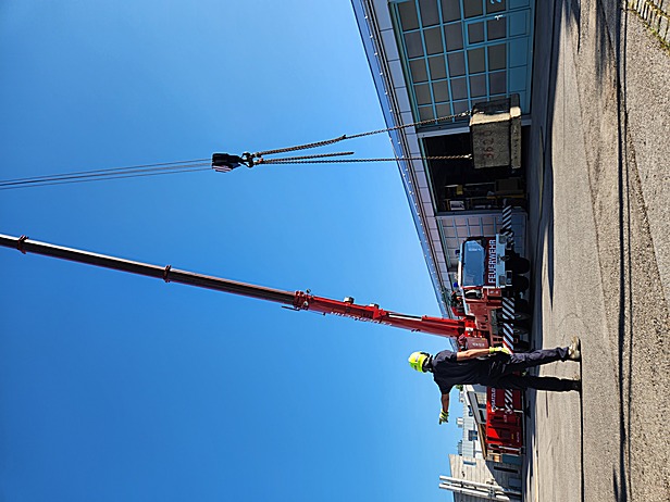 Da die Sicht des Kranfahrers auf die Last blockiert ist, ist ein Einweiser nötig. Auch dies wurde praktisch beübt.
