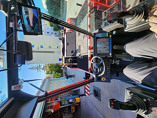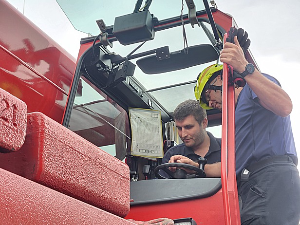 In der Praxis lernten die Teilnehmer sowohl einen Fahrzeug-, als auch einen Ladekran kennen und grundlegend bedienen.Beginnend beim sicheren Aufstellen des Fahrzeugs wurden die Unterschiede zwischen Fahrzeugkran und Ladekran praktisch demonstriert. Nach der Aufstellungsprüfung musste eine Last fachgerecht angeschlagen und für den Hub vorbereitet werden. Das knapp drei Tonnen schwere Betongewicht galt es nun, zielgenau von einer Position auf eine andere zu heben, und das ohne die Last in eine Pendelbewegung zu bringen.