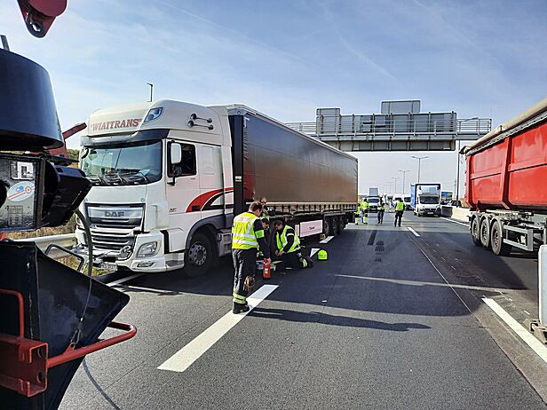 Nach einem Auffahrunfall zwischen zwei LKWs galt es einen Sattelzug von der Fahrbahn zu entfernen. Dieser wurde zuerst mit der 20 Tonnen Seilwinde des Krans gerade gezogen und anschließend mittels Abschleppvorrichtung zum nächst gelegenen Rastplatz geschleppt. Den weiteren Abtransport übernimmt eine Fachfirma.