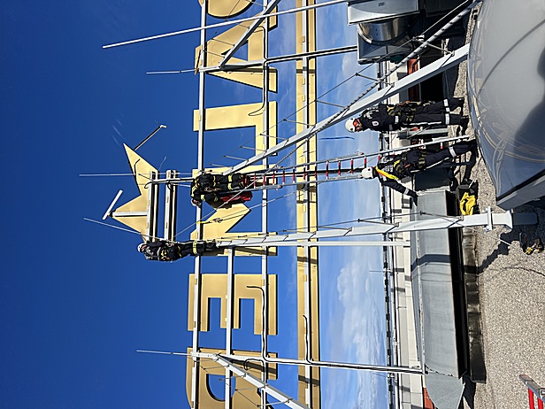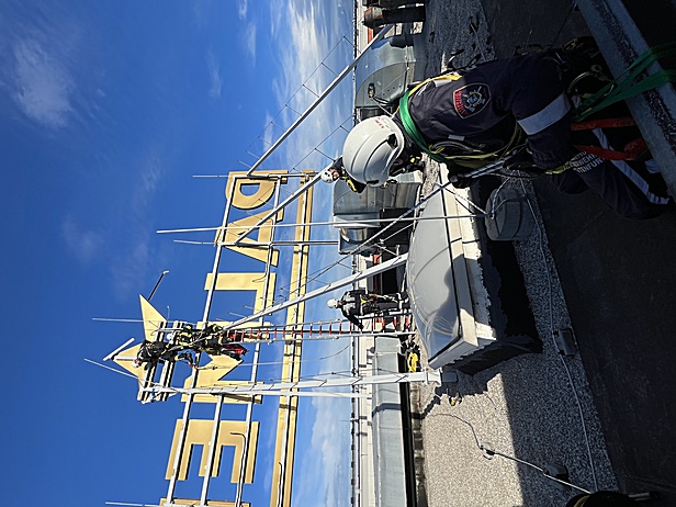 Die Höhenrettungsgruppe musste am Dach des Palmers Hochhauses aktiv werden, um ein bedrohlich wankendes Reklameschild auf einer Höhe von rund 50 Metern zu sichern. Präzise und sicher haben die spezialisierten Feuerwehrmitglieder in luftiger Höhe die Lage unter Kontrolle gebracht.