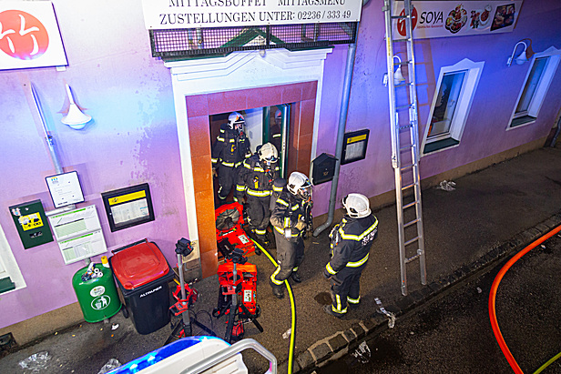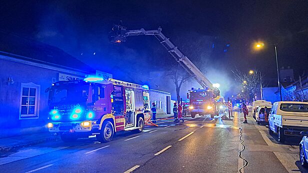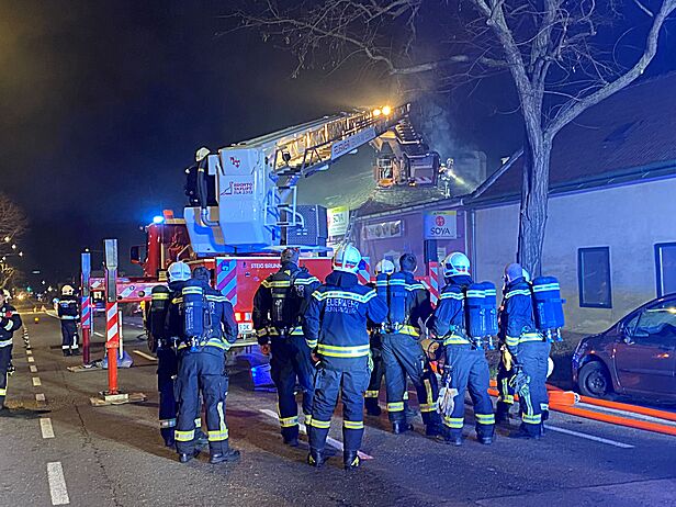 Zu diesem Zeitpunkt hatte sich das Feuer schon über den Dunstabzug ausgebreitet und Flammen schlugen aus dem Dach. Daher wurde der Brand von außen über den Hubsteiger der FF Brunn am Gebirge bekämpft. Nach dem Ablöschen der letzten Glutnester im Bereich der Absauganlage rückten die ersten Kräfte wieder in das Feuerwehrhaus ein, um mit den Reinigungsarbeiten zu beginnen.