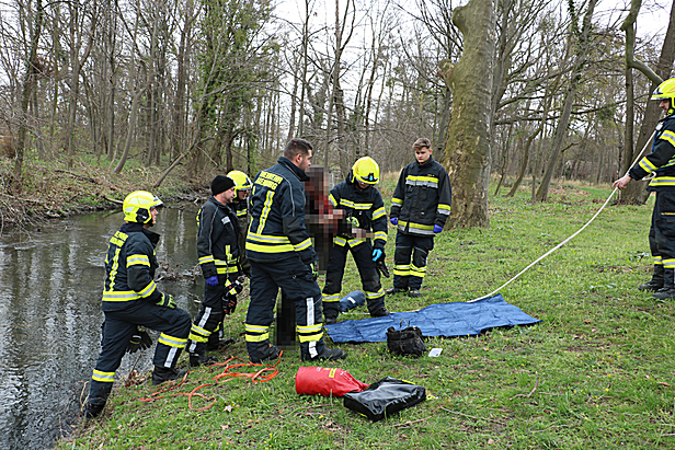 Eine Spaziergängerin war von ihrem Hund mit der Leine über eine Böschung gezogen worden und in das Bachbett des Triestingkanals gestürzt. Die Dame konnte sich nicht mehr selbstständig aus dem Gewässer befreien, weil sie im schlammigen Untergrund feststeckte. Der Hund kam nicht zu Schaden und war wohlauf am Ufer.