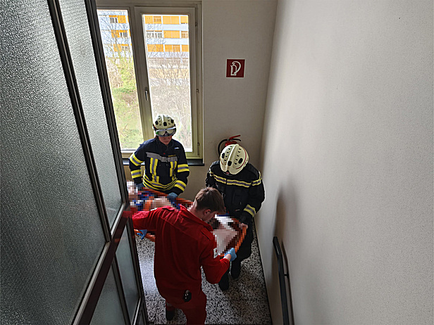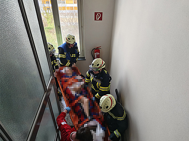 Die Feuerwehr unterstützte den Rettungsdienst beim Abtransport einer verletzten Person aus dem sechsten Obergeschoss. Da für das ebenfalls ausgerückte Hubrettungsgerät keine geeignete Aufstellfläche zur Verfügung stand, war ein schonender Transport der Patientin über das Stiegenhaus notwendig. Aus diesem Grund trugen die Einsatzkräfte die Person über das Stiegenhaus zum Rettungswagen.
