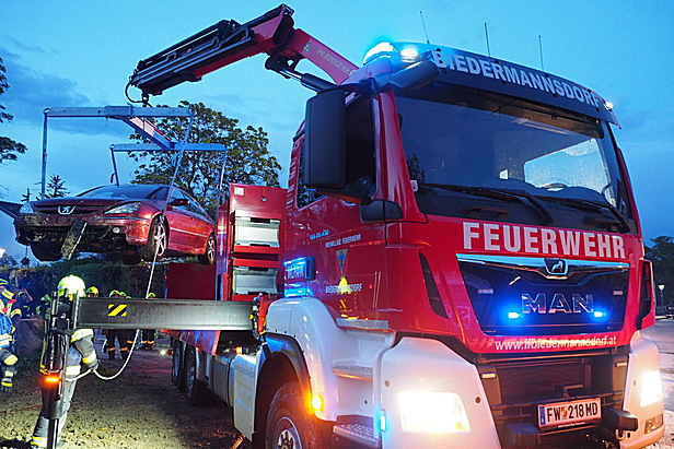 Der PKW wurde von der Feuerwehr Biedermannsdorf mit dem Kranfahrzeug aus dem schlammigen Erdreich geborgen.