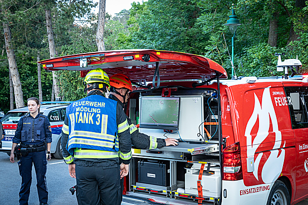 Der Brandherd konnte erst unter Zuhilfenahme einer Drohne mit Wärmebildkamera und in weiterer Folge eines zwischenzeitlich eingetroffenen Hubschraubers des Innenministeriums auf einem schwer zugänglichen Bergrücken im Einsatzgebiet der Feuerwehr Mödling lokalisiert werden. Zu diesem Zeitpunkt waren bereits ca. 2.000 m² Fläche vom Bodenfeuer im Föhrenwald betroffen, wobei sich der Brand durch den Wind rasch ausbreitete.