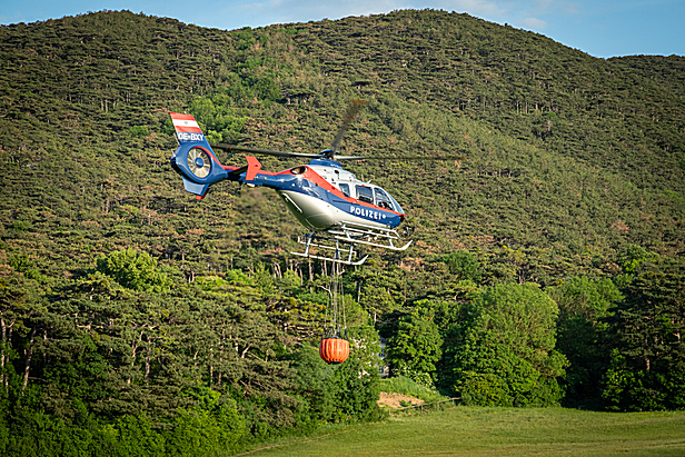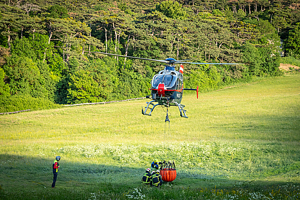 Der Löschhubschrauber wurde in Zusammenarbeit der Feuerwehr Wiener Neudorf und der Feuerwehr Mödling an der Meiereiwiese befüllt. Dabei wurden an die 10.000 Liter Löschwasser über der Brandstelle abgeworfen.