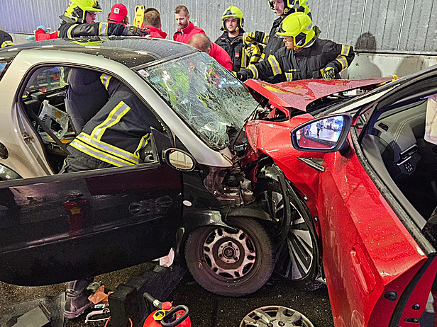 Vor Ort angekommen zeigte sich folgendes Szenario: Aus ungeklärter Ursache kam ein Fahrzeug in der Kurve der Bahnunterführung der Pottendorferlinie von seiner Fahrspur ab und prallte frontal in ein entgegenkommendes Fahrzeug. Der Fahrer eines der Fahrzeuge wurde durch den Aufprall in seinem Fahrzeug eingeklemmt. Unmittelbar nach dem Eintreffen der Feuerwehr wurde die Einsatzstelle abgesichert. Parallel dazu richtete sich der Fokus auf die schonende Menschenrettung der glücklicherweise ansprechbaren, eingeklemmten Person. Mittels hydraulischen Rettungsgeräts und unter der Betreuung des Fahrers eines "inneren Retters" der Feuerwehr und der eingetroffenen Rettungskräfte konnte deformierte Fahrertür entfernt und der eingeklemmte Fahrer mittels Spineboards aus seinem Fahrzeug gerettet werden.