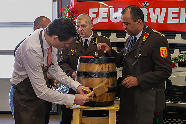 Im Anschluss wurde das Wort an Bürgermeister Hannes Koza übergeben, der die hervorragende Zusammenarbeit zwischen Feuerwehr und Gemeinde betonte. Auch Feuerkommandant Amang Hajo nutze die Möglichkeit, um den Besucherinnen und Besuchern einen Einblick in den langwierigen Beschaffungsweg eines solchen Fahrzeugs zu geben und bedankte sich an dieser Stelle auch bei den Kameraden für die tagtäglich geleistete Arbeit. Nach der Messe folgte die offizielle Festeröffnung um 12:00 Uhr mit dem klassischen Bieranstich durch Bürgermeister und Feuerwehrkommandanten.