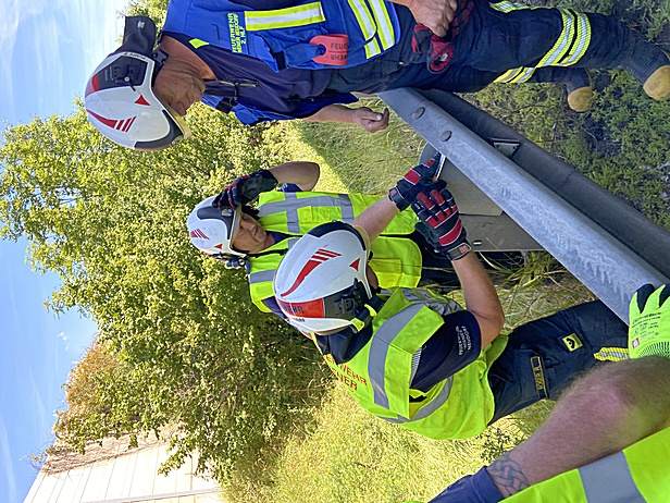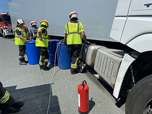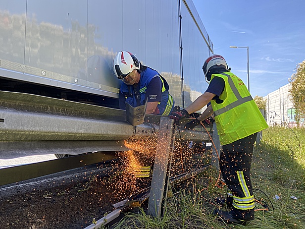 Durch die Feuerwehr Wiener Neudorf wurden gleich nach Eintreffen mittels Auffangwanne austretende Betriebsstoffe aufgefangen. In weiterer Folge mussten 400 Liter Diesel aus dem LKW Tank in Fässer umgepumpt werden. Anschließend musste vor der Bergung die Leitschiene entfernt werden. Dabei kamen unter anderem eine Säbelsäge und ein Winkelschleifer zum Einsatz.