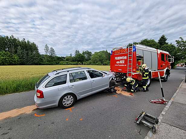 Bei der Ortseinfahrt Gaaden war ein PKW zuerst mit einem parkenden Fahrzeug und anschließend mit einem entgegenkommenden Fahrzeug kollidiert. Die beteiligten Lenker wurden unbestimmten Grades verletzt und mit dem Rettungsdienst ins Krankenhaus gebracht.
