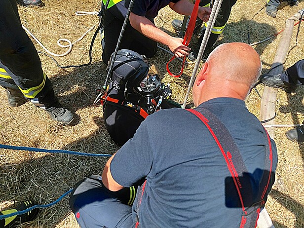 Mittels Dreibeins der Feuerwehr wurde der Verunglückte dann komplett aus dem Rohr und aus dem 6 Meter tiefen Schacht mittels Seiltechnik gehoben.