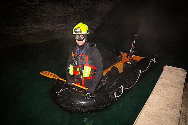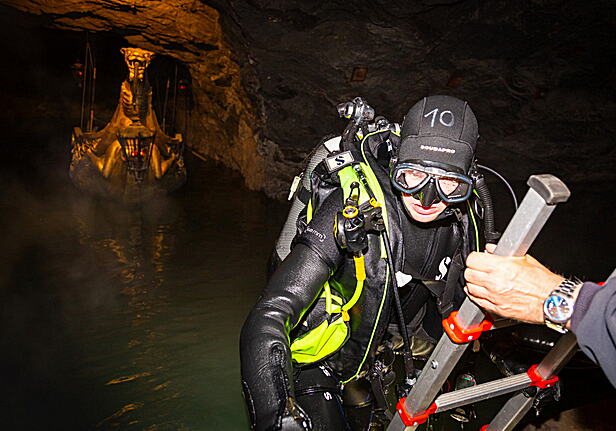 Drei Teams aus je drei Tauchern folgten ihren Einsatzaufträgen und suchten verschiedene Bereiche der Grotte nach vorher versteckten Puppen ab. Ein Team musste dabei in einen ca. 10 Meter tiefen Schacht abtauchen. Beim Tauchen im Wasser der Seegrotte sind nicht nur die Dunkelheit, die Unübersichtlichkeit und das kalte Wasser eine Herausforderung, sondern auch die am Boden abgelagerten Sedimente: bei der kleinsten Wasserbewegung wird der Gipsstaub aufgewirbelt und trübt das Wasser für einige Tage ein.