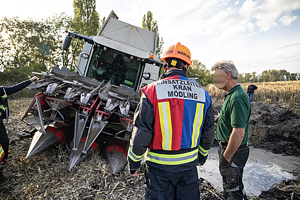 Zu einer aufwändigen Fahrzeugbergung wurde die Kranmannschaft der Freiwilligen Feuerwehr Mödling nach Velm (Bezirk BL) alarmiert. Die örtlich zuständige Feuerwehr Velm forderte die Unterstützung zur Bergung eines Mähdreschers an.
