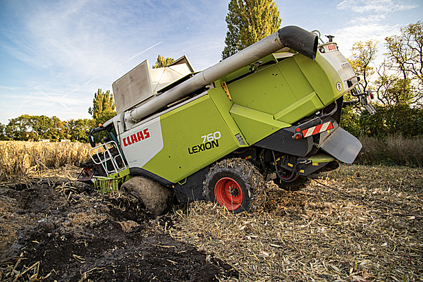 Zuvor war die Maschine in einen durch das Hochwasser im vergangen Monat in Mitleidenschaft gezogen Teil eines Feldes geraten. Dort änderte sich die Bodenbeschaffenheit des Feldes von einem Meter auf den Anderen derart, dass die Maschine in der weichen Erde stecken blieb.