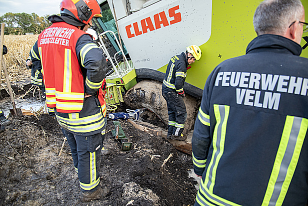 Kraneinsatz zur Unterstützung der Feuerwehr Velm bei Fahrzeugbergung eines Mähdreschers