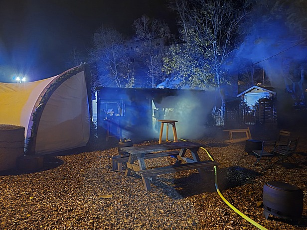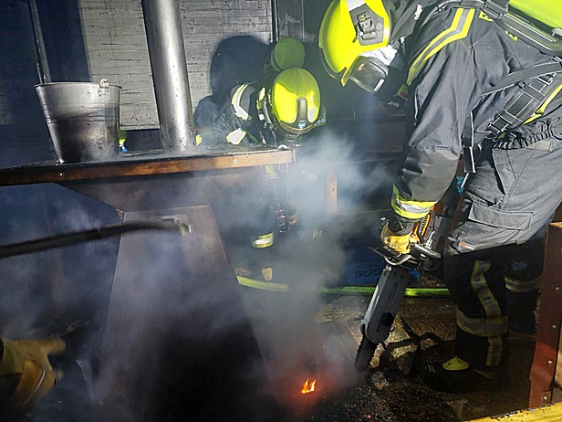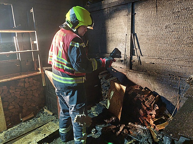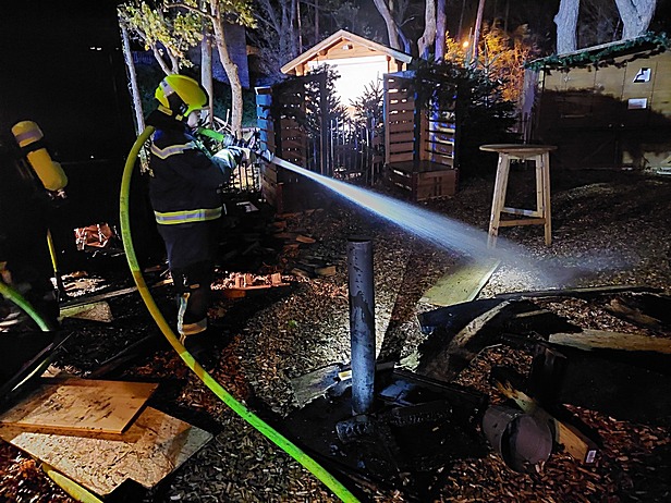 Jedoch wurde den Einsatzkräften am Weg zum Einsatzort über Funk mitgeteilt, dass eine Hütte in Vollbrand stehe. Vor Ort eingetroffen, begab sich ein Atemschutztrupp mit einem C-Rohr zur Brandbekämpfung. Parallel dazu, wurde ein weiterer Atemschutztrupp mit einem zweiten C-Rohr in Stellung gebracht um das Übergreifen auf benachbarte Objekte zu verhindern. Die Wasserversorgung wurde über einen Hydranten sicher gestellt. Die Löschmaßnahmen zeigten schnell Wirkung und die Flammen konnten erfolgreich bekämpft werden. Um alle Glutnester ablöschen zu können wurde der Holzboden mit einer Motorkettensäge geöffnet. Abschließend erfolgte eine Kontrolle mit der Wärmebildkamera.