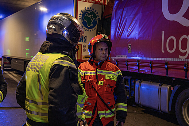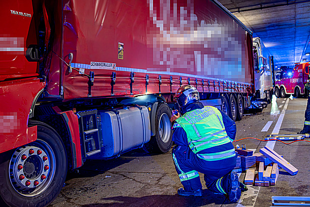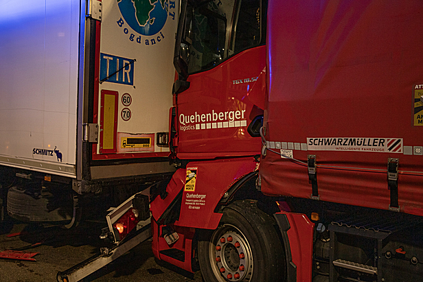 Am Einsatzort stellte sich heraus, dass es sich um einen schweren Auffahrunfall mit vier Sattelkraftfahrzeugen handelte. Eine zunächst eingeschlossene Person konnte sich selbstständig aus ihrem Fahrzeug befreien.