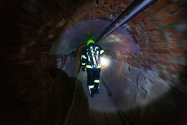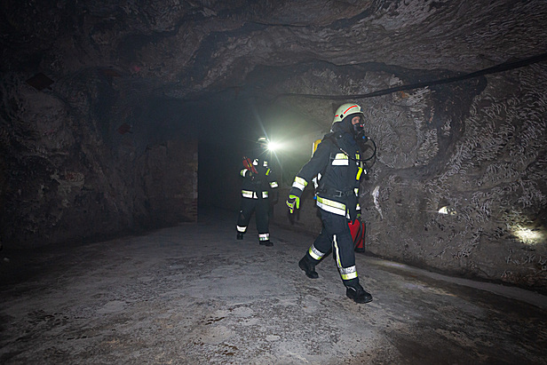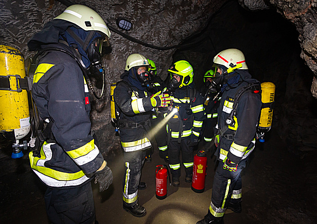 Die Freiwilligen Feuerwehren schickten umgehend mehrere Atemschutztrupps über den Hauteingang sowie über den ehemaligen Förderturm in das aufgelassene Gipsbergwerk. Nach einem rund 300 Meter langen Anmarsch mussten die Trupps an der Rauchgrenze ihre Suche beginnen: Mit Wärmebildkameras wurden bei geringer Sicht und starker Verrauchung alle Seitenstollen der Sohle kontrolliert. Der eine Ebene darunter liegende unterirdische See mit Booten für Rundfahrten war vom Brand nicht betroffen. Ein Atemschutztrupp fand schließlich im Bereich einer Werkstätte verschmorte Akkus von Werkzeugen. Die Batterien wurden abgelöscht und in Wasserkübeln ins Freie gebracht.